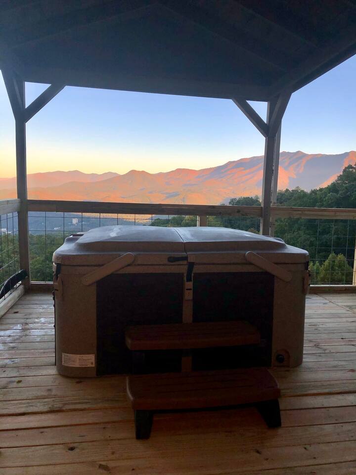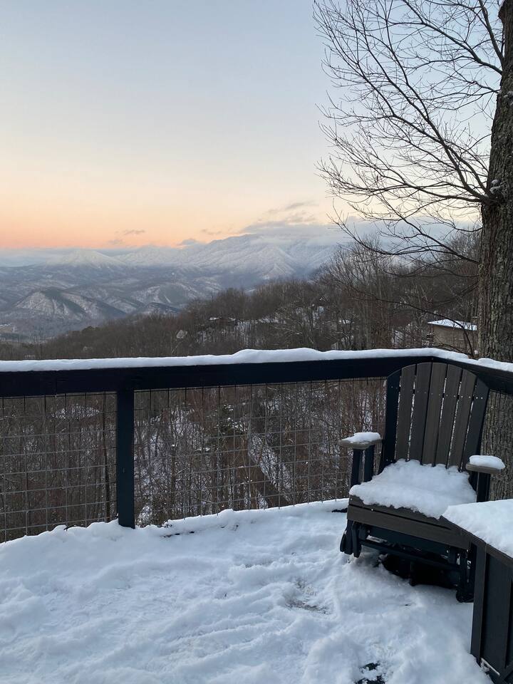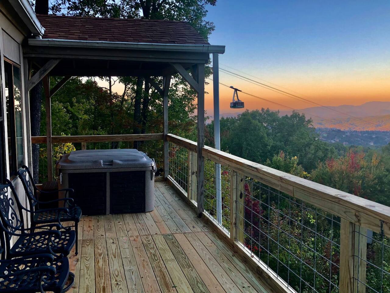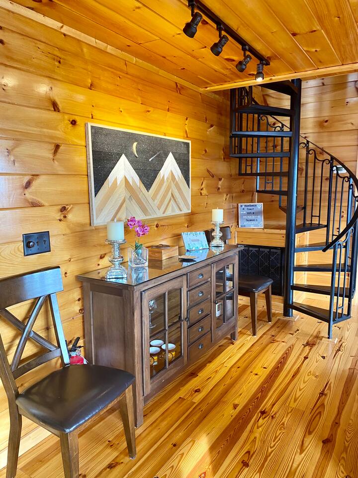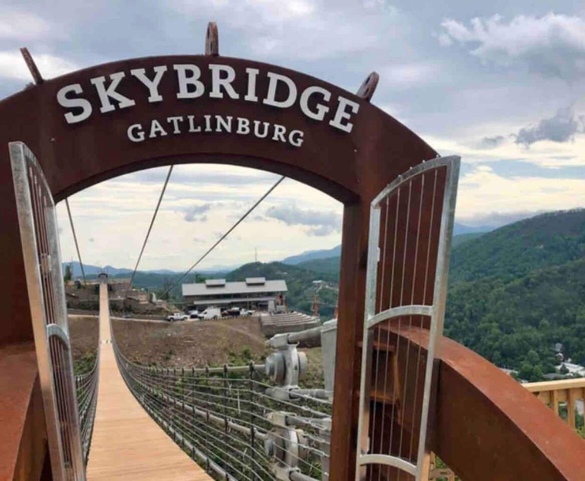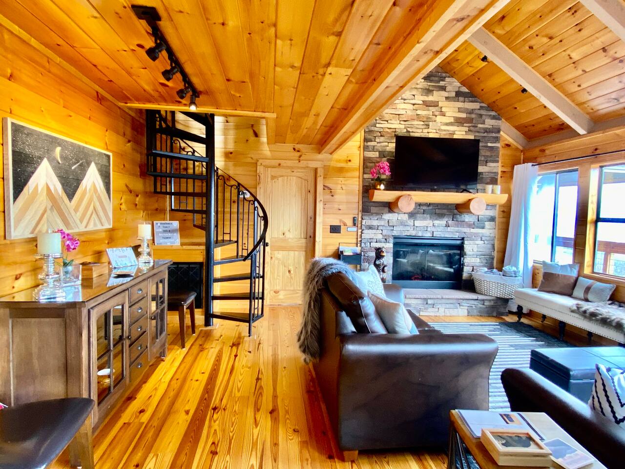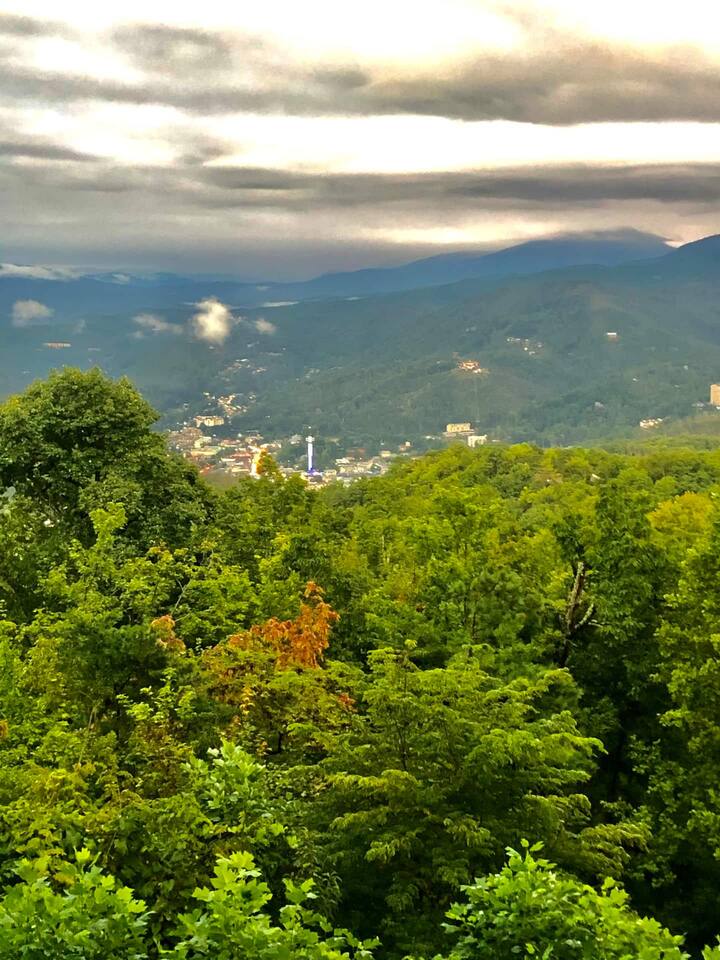 The space Peaceful Wooded Surrounding | Panoramic Mountain Views | Downtown Gatlinburg/Tram Views | Keyless Entry | Outdoor Grill | WIFI | Cable | Chalet Village Pool Access during summer months| Hot Tub Tucked away on a quiet street with only one cabin to your right. The main level features a spacious living room with luxurious leather couches, large windows with mountain views, electric fireplace surrounded by natural stone/authentic log mantle, and 55” large flat screen TV. Fully equipped kitchen and dining area just a few steps away, with dining table on the deck for those wanting to eat outside. First bedroom has a king bed, flat screen TV and connects to the hall bath. Second bedroom has king bed and private bath with direct access to the deck. The beautiful spiral staircase connects the main level to the upper deck where you will find board games and flat screen TV, and a dedicated work area. When staying at our lodge, you will get access to all 3 pools located in Chalet Village during the summer months. NON SMOKING! NO PETS! Parking for two vehicles with split driveway. *** Please note that our cabin is located in The Great Smokey Mountain area and therefore we are surrounded by wild life. Bear sightings in the area are normal, particularly in the Spring and Fall. Please familiarize yourselves with the do's and don'ts when experiencing a bear sighting. Do not leave children unattended. ***