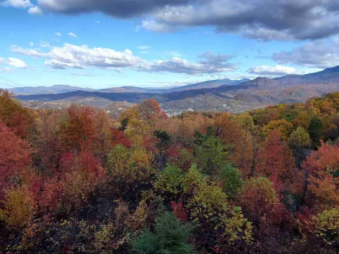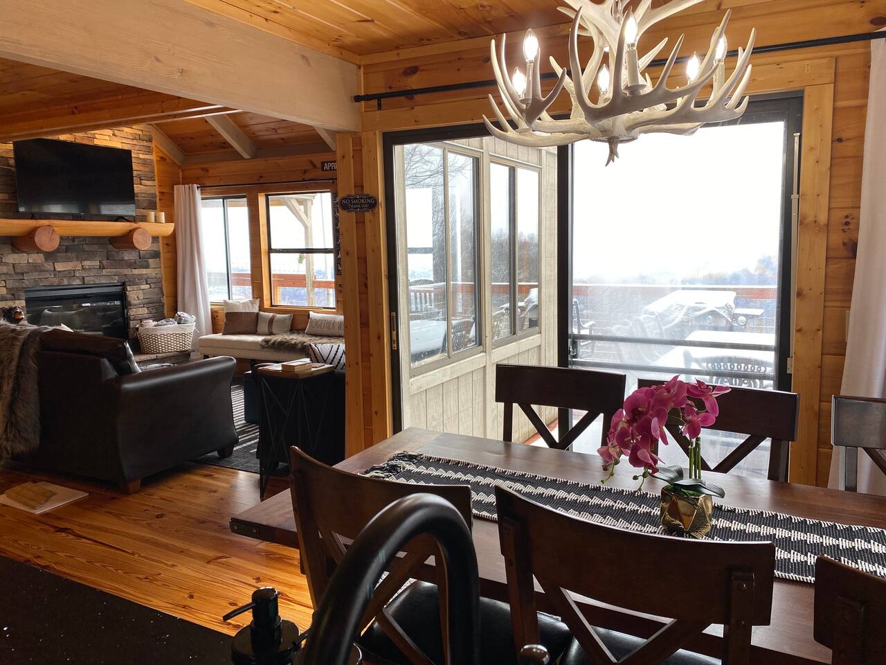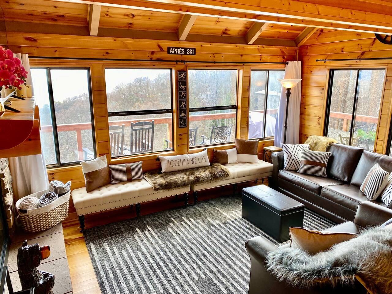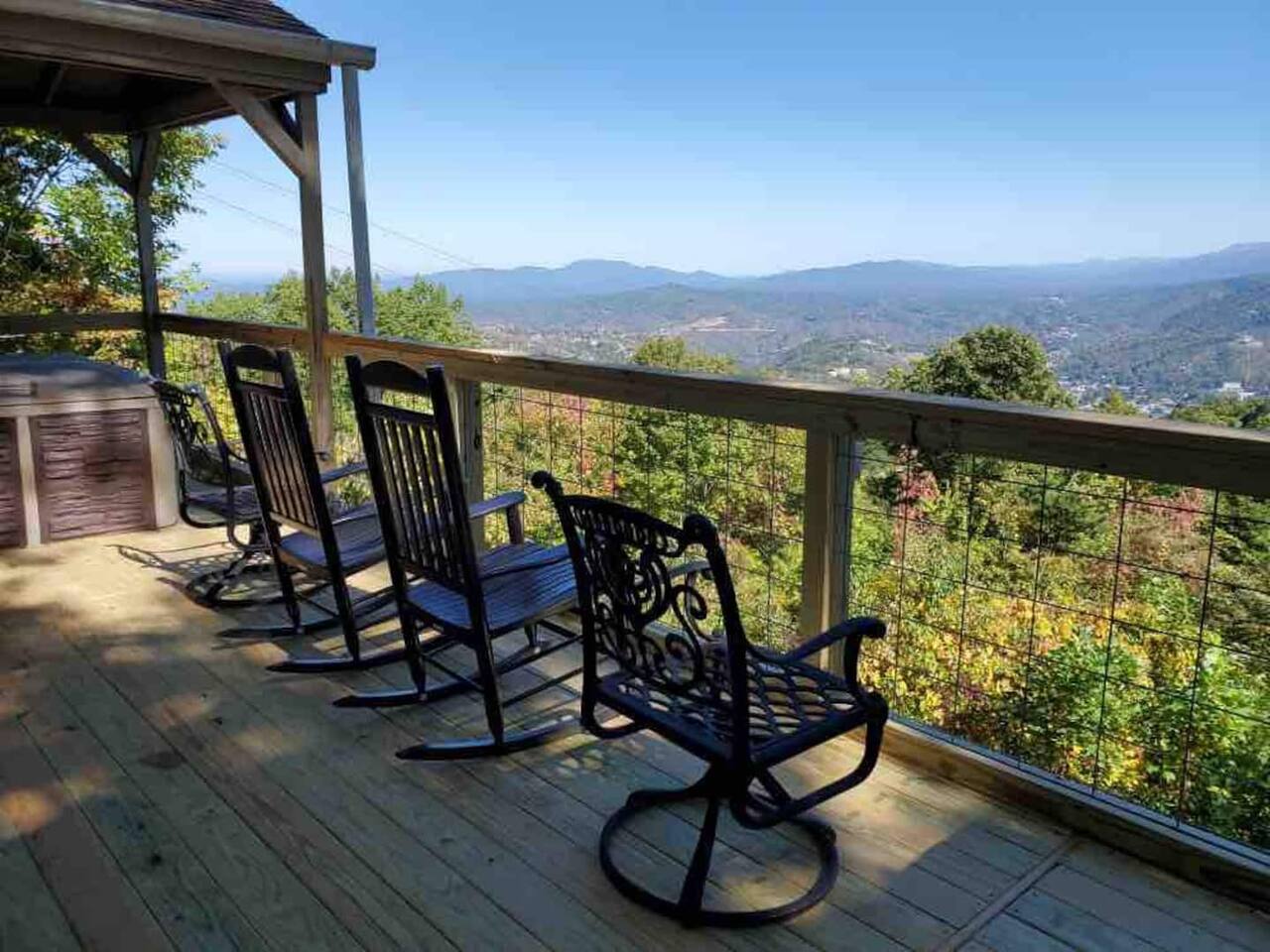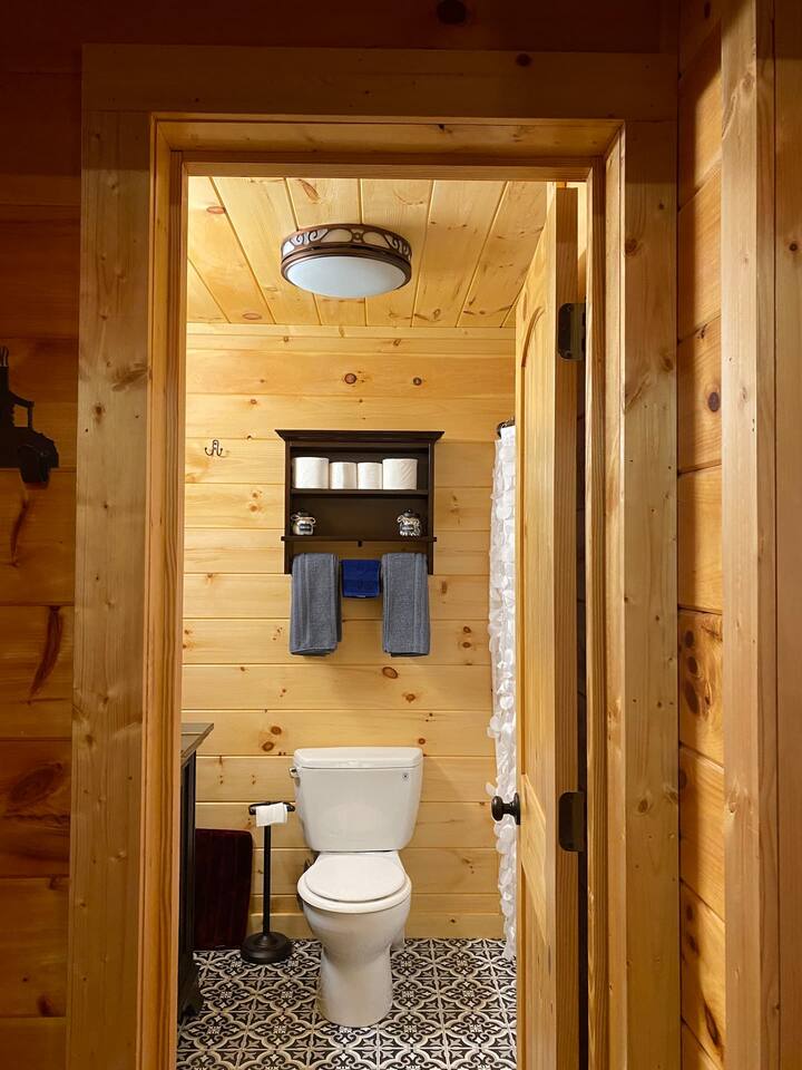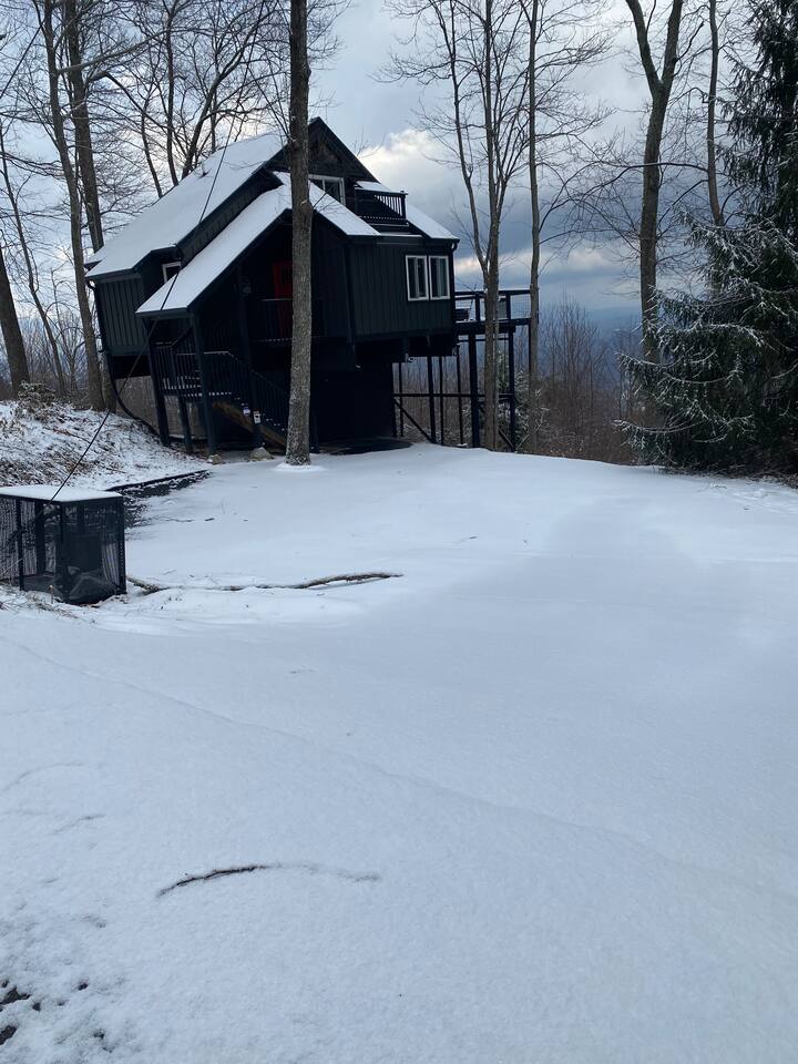The space Peaceful Wooded Surrounding | Panoramic Mountain Views | Downtown Gatlinburg/Tram Views | Keyless Entry | Outdoor Grill | WIFI | Cable | Chalet Village Pool Access during summer months| Hot Tub Tucked away on a quiet street with only one cabin to your right. The main level features a spacious living room with luxurious leather couches, large windows with mountain views, electric fireplace surrounded by natural stone/authentic log mantle, and 55” large flat screen TV. Fully equipped kitchen and dining area just a few steps away, with dining table on the deck for those wanting to eat outside. First bedroom has a king bed, flat screen TV and connects to the hall bath. Second bedroom has king bed and private bath with direct access to the deck. The beautiful spiral staircase connects the main level to the upper deck where you will find board games and flat screen TV, and a dedicated work area. When staying at our lodge, you will get access to all 3 pools located in Chalet Village during the summer months. NON SMOKING! NO PETS! Parking for two vehicles with split driveway. *** Please note that our cabin is located in The Great Smokey Mountain area and therefore we are surrounded by wild life. Bear sightings in the area are normal, particularly in the Spring and Fall. Please familiarize yourselves with the do's and don'ts when experiencing a bear sighting. Do not leave children unattended. ***