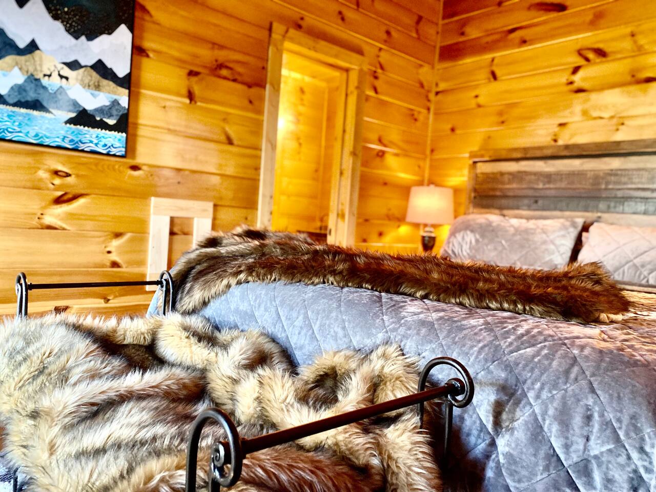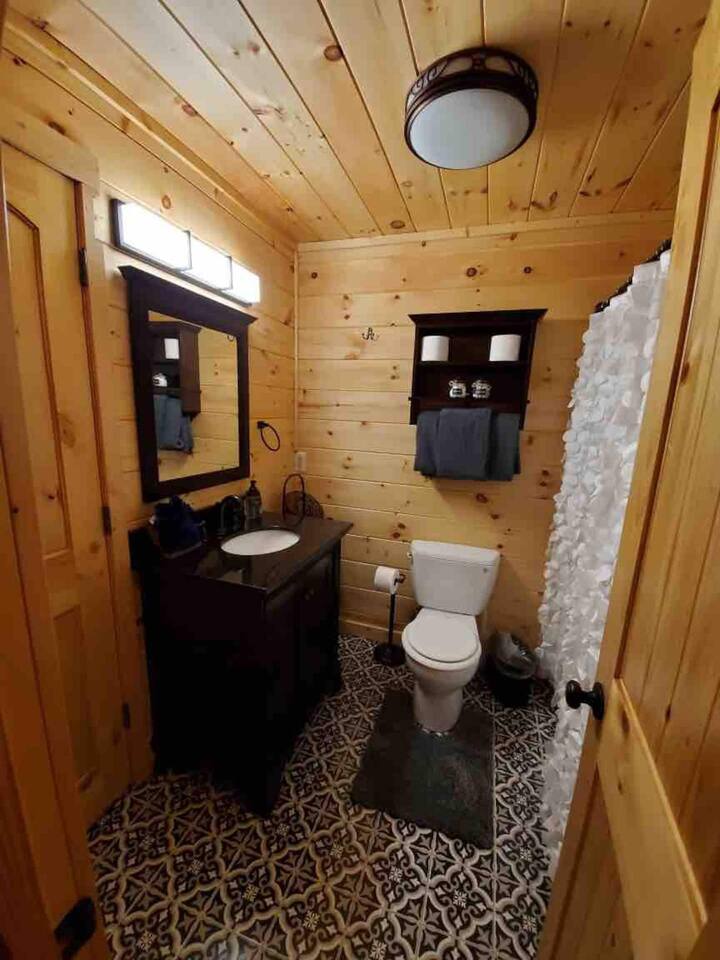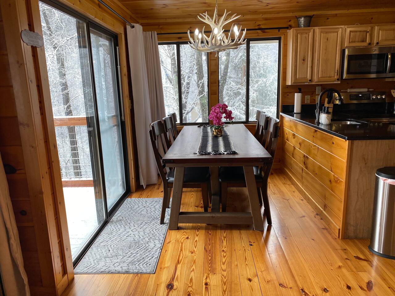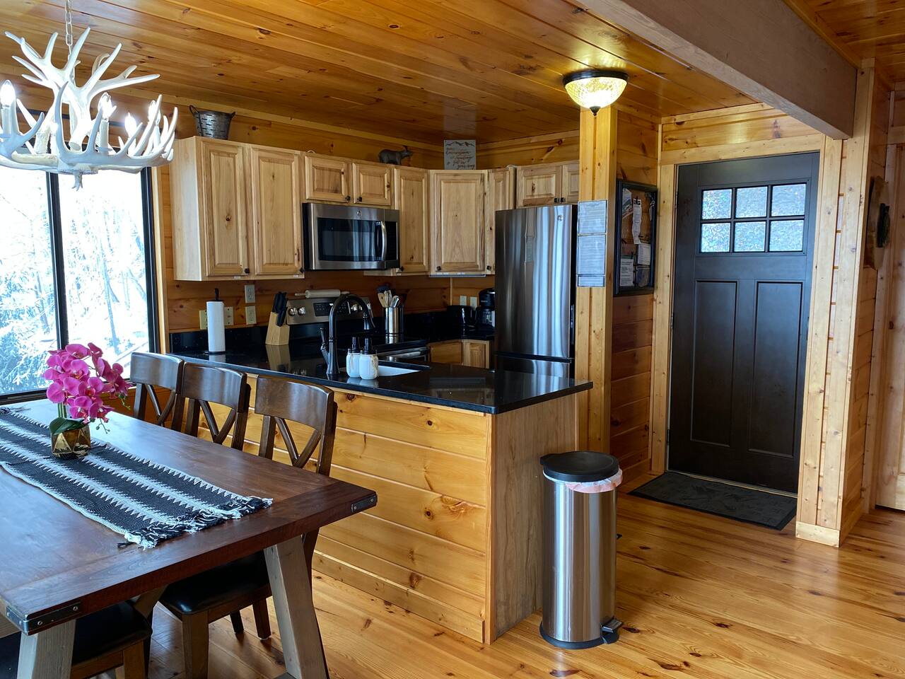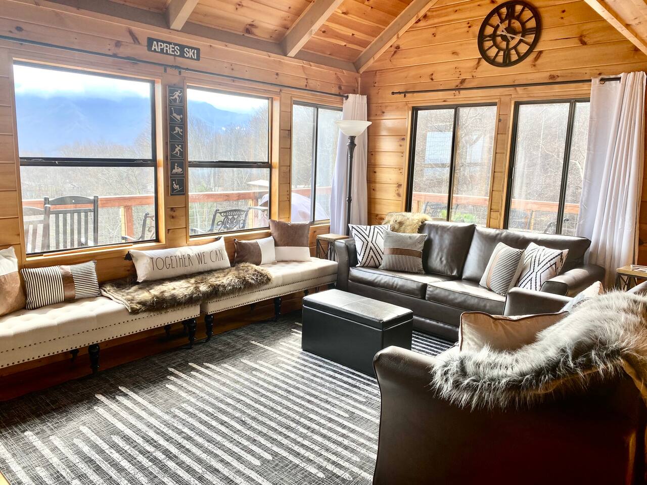 The space Peaceful Wooded Surrounding | Panoramic Mountain Views | Downtown Gatlinburg/Tram Views | Keyless Entry | Outdoor Grill | WIFI | Cable | Chalet Village Pool Access during summer months| Hot Tub Tucked away on a quiet street with only one cabin to your right. The main level features a spacious living room with luxurious leather couches, large windows with mountain views, electric fireplace surrounded by natural stone/authentic log mantle, and 55” large flat screen TV. Fully equipped kitchen and dining area just a few steps away, with dining table on the deck for those wanting to eat outside. First bedroom has a king bed, flat screen TV and connects to the hall bath. Second bedroom has king bed and private bath with direct access to the deck. The beautiful spiral staircase connects the main level to the upper deck where you will find board games and flat screen TV, and a dedicated work area. When staying at our lodge, you will get access to all 3 pools located in Chalet Village during the summer months. NON SMOKING! NO PETS! Parking for two vehicles with split driveway. *** Please note that our cabin is located in The Great Smokey Mountain area and therefore we are surrounded by wild life. Bear sightings in the area are normal, particularly in the Spring and Fall. Please familiarize yourselves with the do's and don'ts when experiencing a bear sighting. Do not leave children unattended. ***