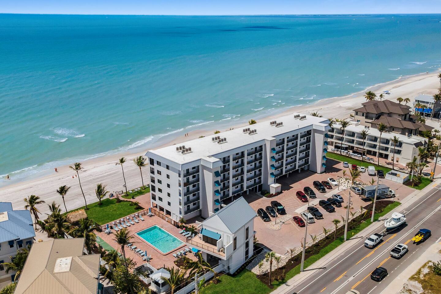 Solmate is a well-appointed, breathtaking beach front condo located mid-island on beautiful Fort Myers Beach, FL. This is a 2br/2ba third floor unit with direct beach front views. The condo sleeps up to 6 people. The full kitchen has everything you need from pans to an air fryer and everything else in between. The bedrooms and living room have flat screen 4K HD Smart Tvs for your entertainment. Supermarket is located literally across the street.